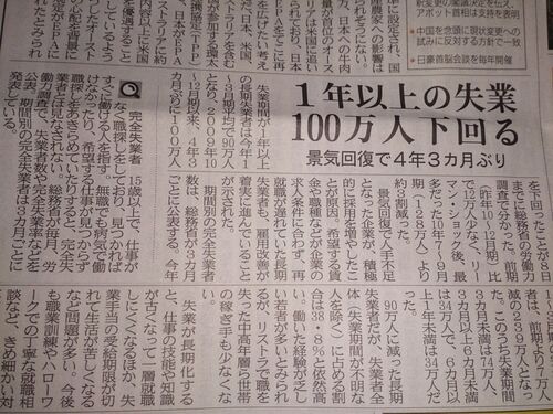 静岡新聞7/9の朝刊記事がこれ。 電子記事がこれ。 失業期間が1年以上の長期失業者は今年1〜3月期平均で90万人となり、2009年10〜12月期以来、4年3カ月ぶりに100万人を下回ったことが8日までに総務省の労働力調査で分かった。前期(昨年1…